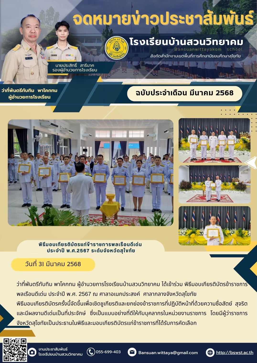 พิธีมอบเกียรติบัตรแก่ข้าราชการพลเรือนดีเด่น ประจำปี พ.ศ. 2567 ระดับจังหวัดสุโขทัย